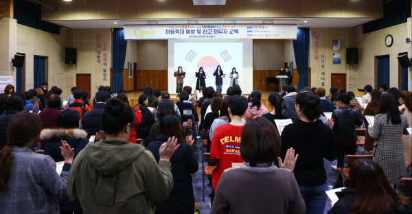 인천 미추홀구 육아종합지원센터는 19일 구청 대회의실에서 어린이집 보육교직원 200여명을 대상으로 아동학대 예방교육을 실시했다. 교육은 노정환 국가인권위원회 소속 강사가 맡아 참석자 전원의 아동권리존중 선포식을 시작으로 아동권리와 아동학대의 이해, 아동학대 예방을 위한 실천 방향 등의 내용으로 진행됐다. 사진은 선포식이 진행 중인 모습. (사진제공=인천미추홀구청)