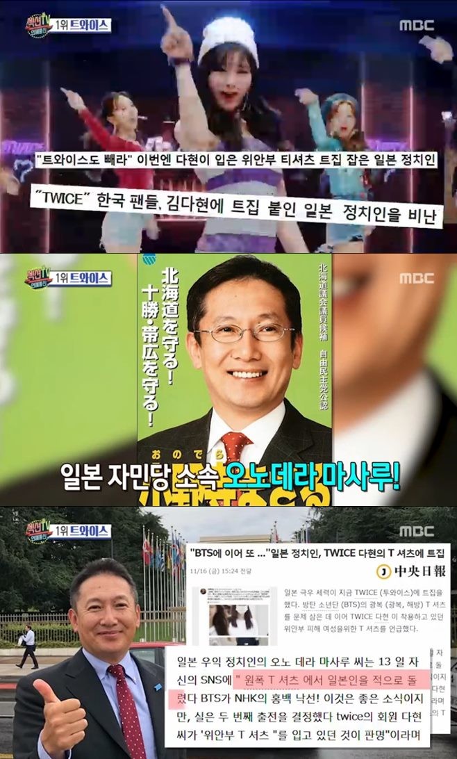 일본 홋카이도 현의원이자 자민당 소속 극우 정치인 오도네라 마사로는 지난 13일 자신의 SNS 계정을 통해 BTS 사태를 언급하며, 트와이스 다현이 위안부 성원 티셔츠를 입은 것을 부정적으로 언급했다.