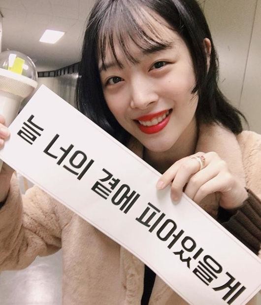 공개된 사진 속 설리는 '늘 너의 곁에 피어있을게'라는 응원 문구가 적힌 플랜카드를 들고 밝게 미소를 짓고 있다.