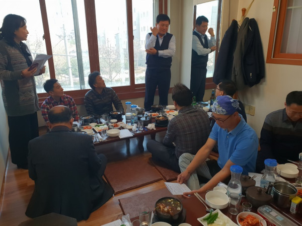 경기 수원시 권선구에서는 20일 세류동 소재 ‘송할머니옻닭집’에서 모범음식점 운영 및 음식문화 개선을 위한 한국외식업중앙회 권선구지부 임직원과 간담회를 개최했다. 사진은 조인상 구청장 및 관계자들이 이야기를 나누는 모습. (사진제공=권선구청)