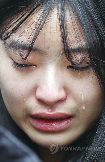 정부가 화해치유재단을 해산한다고 공식 발표한 21일 서울 종로구 옛 일본대사관 앞에서 열린 일본군 위안부 문제 해결을 위한 정기 수요시위에 참가한 한 학생이 위안부 피해 할머니의 음성을 들으며 눈물을 흘리고 있다.