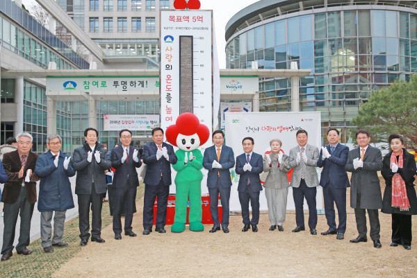 서울 도봉구가 21일 구청광장에서 지역사회보장협의체 위원장 및 주민들이 참석한 가운데 ‘2019희망온돌 따뜻한 겨울나기’ 모금사업의 시작을 알리는 ‘사랑의 온도탑’ 제막식을 진행했다. 사진은 제막식에 참여한 이동진 구청장(가운데)의 모습. (사진제공=도봉구청)
