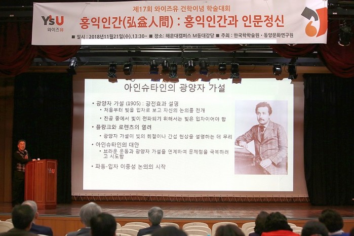 | ▲ 임경순 교수가 21일 열린 와이즈유 건학이념 학술대회에서 '양자역학과 새로운 세계관'이라는 주제로 발표를 하고 있다 | ||