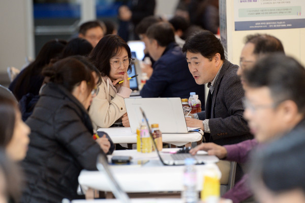 동대문구 수험생과 학부모들을 위한 2019학년도 수능 가채점 결과 분석 설명회가 21일 개최됐다. 사진은 동대문구청 강당 로비에서 서울진학지도협의회 교사들이 수험생 및 학부모를 대상으로 1대1 맞춤 입시 컨설팅을 진행하고 있는 모습. (사진제공=동대문구청)