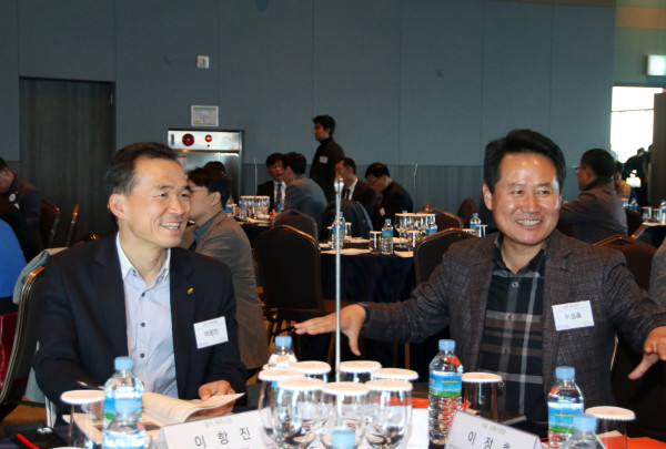 최근 이항진 경기 여주시장이 부산 동구 아스티호텔 대연회장에서 열린 목민관 클럽 민선7기 제2차 정기포럼 ‘우리가 꿈꾸는 똑똑한 도시, 스마트시티를 읽다’에 참석했다. 사진은 포럼에 참석한 이 시장(왼쪽)이 허필홍 강원 홍천군수와 이야기를 나누고 있는 모습. (사진제공=여주시청)