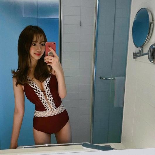 공개된 사진 속 김진아는 버건디 색 수영복을 입고 포즈를 취하고 있다.