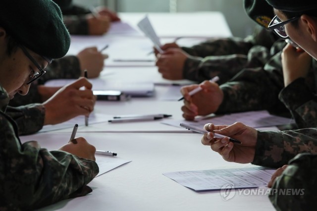 26일 KTX 서울역에서 코레일·중소기업진흥공단·국방부 주최로 열린 서울 청년 채용박람회에서 전역을 앞둔 군인들이 고심하며 이력서를 작성하고 있다.