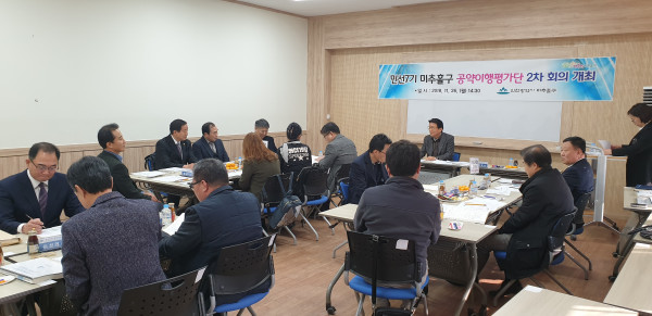 인천 미추홀구는 26일 구청 노인인력센터 회의실에서 민선7기 공약이행평가단 2차 회의를 개최했다. 이날 회의에서는 ▲구청장 공약사항 실천계획 검토 및 수정안 심의 ▲공약사항 추진 개선방안 등의 논의가 이뤄졌다. 사진은 관계자들의 회의하는 모습. (사진제공=미추홀구청)