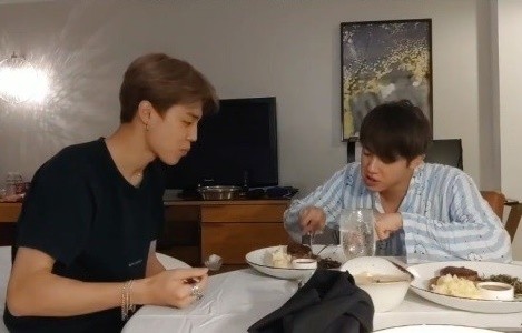지민은 호텔방에서 먹방도 선보였다. "혼자하기 좀 그래서 진 형을 불렀다. 음식도 미리 준비했다"는 지민은 팬들에게 푸짐하게 차려진 식탁을 보여줬다.
