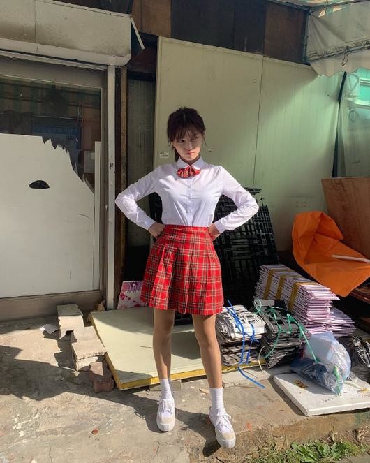 사진 속에는 김유정은 귀여운 교복을 차려입고 있는 모습이다. 청순하면서도 귀여운 미모가 시선을 사로잡는다.