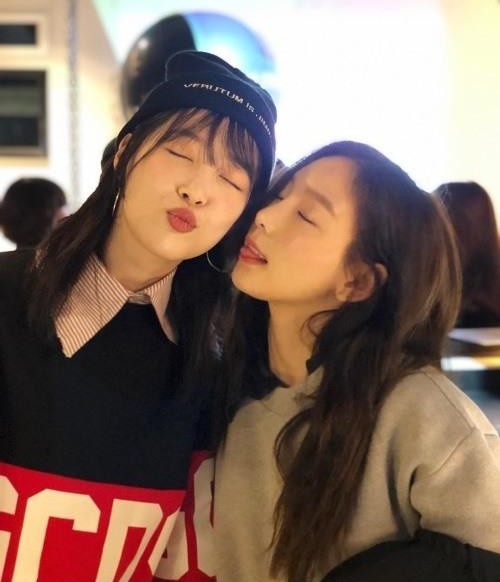사진 속 설리는 비니를 쓴 귀여운 패션이다. 설리는 태연과 함께 눈을 감고 귀여운 표정을 짓고 있다. 태연은 설리를 향해 혀를 내밀며 깜찍함을 드러냈다.