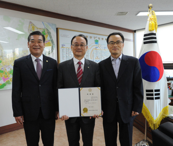 | ▲ 양천구의회 법률고문으로 위촉된 송모충 변호사(가운데)가 신상균 의장(왼쪽)과 함께 기념촬영을 하고 있다. (사진제공=양천구의회) | ||