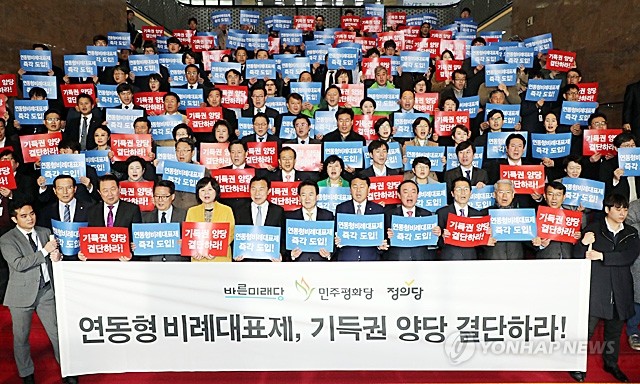 바른미래당 손학규 대표와 김관영 원내대표, 민주평화당 정동영 대표와 장병완 원내대표, 정의당 이정미 대표와 윤소하 원내대표가 3당 의원 및 당직자들과 함께 28일 국회본청 로텐더홀에서 열린 연동형 비례대표제 촉구 결의대회에 참석해 더불어민주당과 자유한국당에 결단을 촉구하는 구호를 외치고 있다.