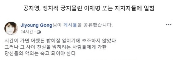 이어 “시간이 가면 어쨌든 밝혀질 일이기에 초조하지 않았다”며 “그러나 그사이 진실을 밝히려는 사람들에게 가한 당신들의 악의는 숙고돼야 한다”고 지적했다.
