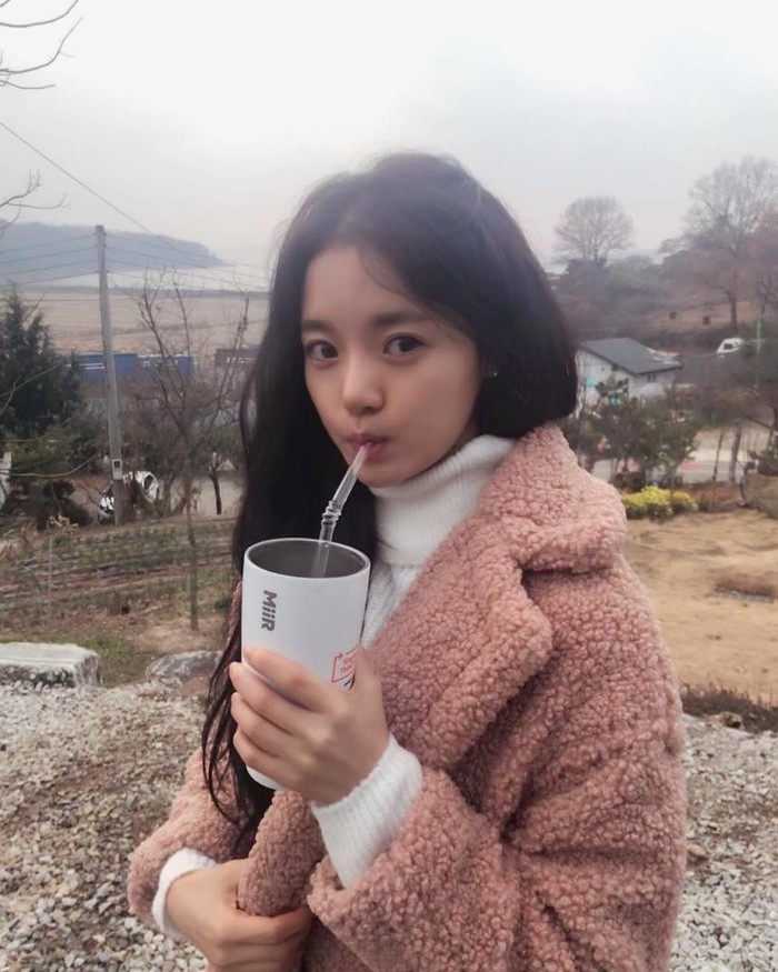 공개된 사진 속 고보결은 텀블러를 손에 든 채 카메라를 응시 중이다.