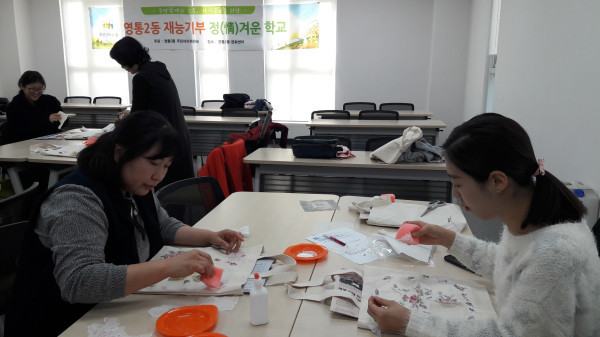 경기 수원시 영통구 영통2동 주민자치센터 3층 인문학방에서 28일 ‘냅킨아트로 만드는 나만의 에코백’ 강의가 진행됐다. 이날 강의는 일상 생활 속의 친숙한 물건인 냅킨과 에코백(친환경 가방)을 새롭게 디자인하는 감성교육으로 진행됐다. 사진은 참여자들이 에코백을 만들고 있는 모습. (사진제공=영통구청)