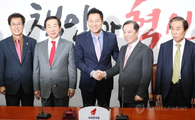 29일 오전 국회에서 열린 오세훈 전 서울시장 자유한국당 입당 환영식에서 오 전 시장이 김병준 비대위원장과 악수하고 있다.