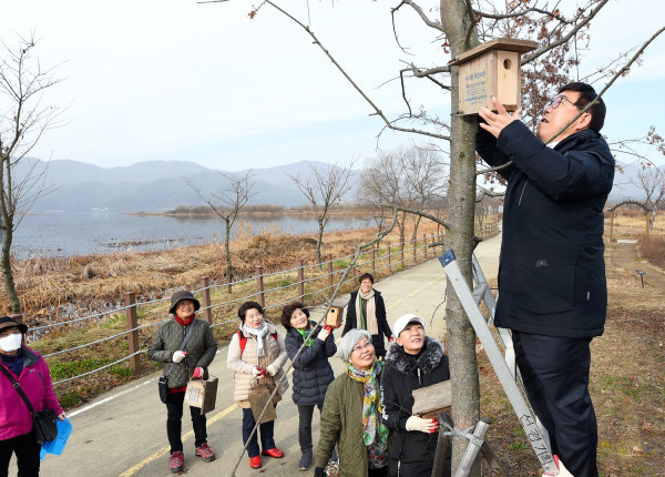 경기 광주시 지속가능발전협의회는 최근 남종면 팔당물안개공원에서 시 공무원들과 함께 조류생물자원 보전 캠페인의 일환으로 ‘새 집 달아주기’ 행사를 실시했다. 이날 인공둥지 30여개가 설치됐다. 사진은 협의회 관계자가 인공둥지를 설치하는 모습. (사진제공=광주시청)