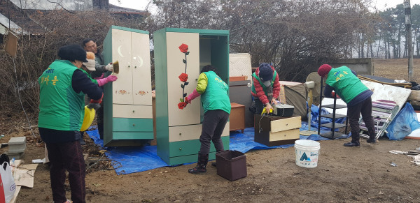 경기 여주시 점동면은 최근 9일에 걸쳐 지역내 복지사각지대에 놓여있는 주민을 대상으로 노후된 전선교체, 전기설비, 화장실(정화조) 설치, 도배·장판, 씽크대 설치 등의 주거환경 개선 활동을 실시했다. 사진은 오래된 가구를 철거하는 모습. (사진제공=여주시청)