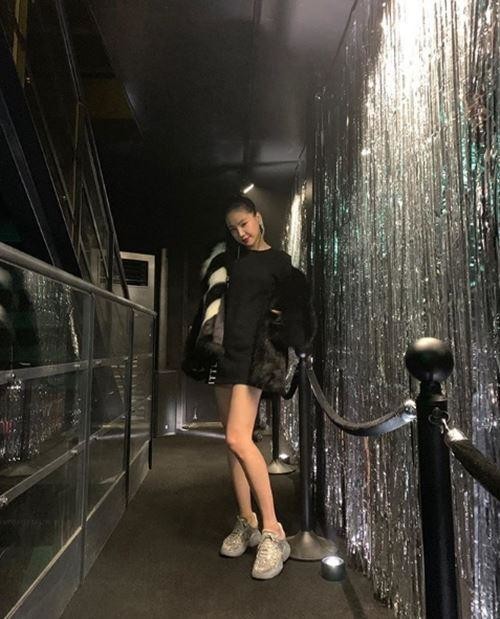 흠잡을 곳 없는 비율과 늘씬한 다리 선이 감탄을 자아낸다. 연예계 패셔니스타다운 센스도 돋보인다. 드레스 아래로 언밸러스하게 매치한 회색 운동화가 눈길을 끈다.
