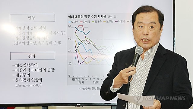자유한국당 김병준 비상대책위원장이 2일 오전 국회에서 기자간담회를 열고 당내 계파 갈등 해소방안 등을 담은 정치개혁구상 ‘i 폴리틱스’를 공개하고 있다.