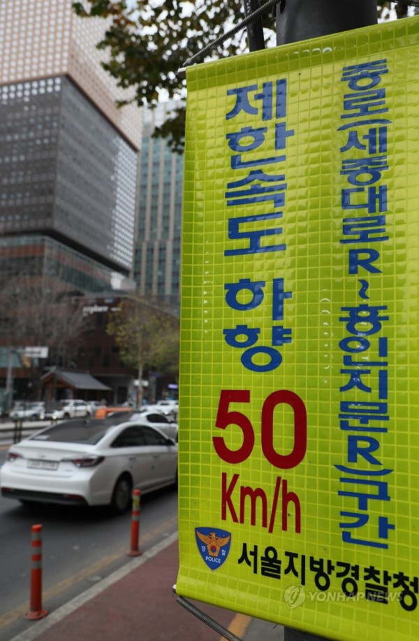 서울시는 보행자 교통사망사고를 줄이기 위해 오는 2019년부터 서울 사대문 안 차량 제한속도를 간선도로는 시속 50km, 이면도로는 시속 30km로 낮춘다고 3일 밝혔다. 적용도로는 사직로∼율곡로∼창경궁로∼대학로∼장충단로∼퇴계로∼통일로로 둘러싸인 사대문 안과 청계천로 전체구간(청계1가∼서울시설공단 교차로) 등 총 41곳이다. 사진은 서울 도심에 설치된 시속 제한 안내문.
