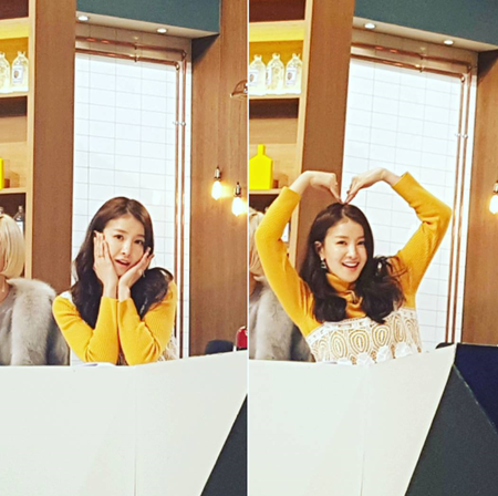 머스터드 티셔츠에 흑발로 모습을 드러낸 이시영은 두 손으로 얼굴을 가리며 부끄러운 표정을 짓다가 금세 활짝 웃으며 머리 위로 하트를 그린다.