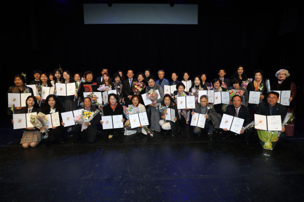 최근 서울 강남구가 서울종합예술실용학교에서 열린 ‘2018 강남구 자원봉사자대회’에서 우수 자원봉사자 59명을 시상했다. 사진은 시상 후 기념촬영을 하고 있는 수상자들의 모습. (사진제공=강남구청)