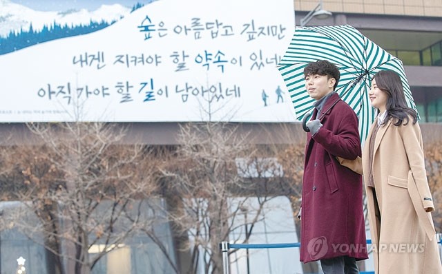 3일 오전 새 옷으로 갈아입은 서울 교보생명 광화문글판 앞에서 관계자들이 길을 걷고 있다. 이번 교보생명 광화문글판 ‘겨울편’은 로버트 포레스트의 시 ‘눈 내리는 저녁 숲가에 멈춰 서서’에서 가져왔다.
