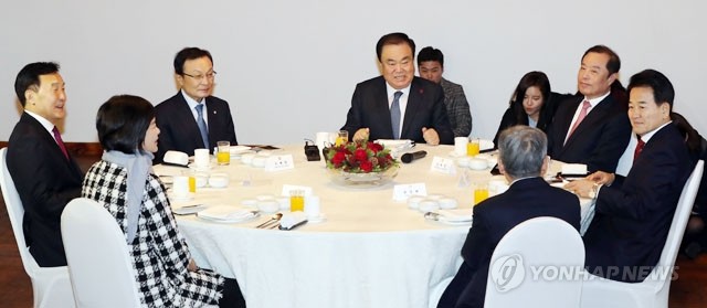 문희상 국회의장과 각당 대표들이 3일 국회 사랑재에서 열린 국회의장 주최 초월회 오찬 행사에서 의견을 나누고 있다. 문 의장 부터 시계방향으로 자유한국당 김병준 비대위원장, 유인태 국회사무총장, 정의당 이정미, 바른미래당 손학규, 더불어민주당 이해찬 대표.
