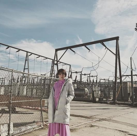 공개된 사진 속 이솜은 분홍색 원피스를 입고, 그 위에 흰색 롱패딩을 걸친 모습이다.