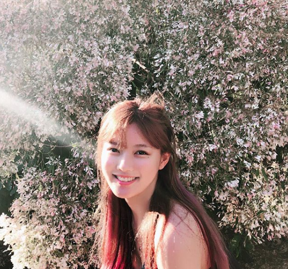 사진 속에서 김유정은 민소매 원피스를 입고 꽃밭에서 밝게 웃고 있는 모습이 담겨있다.