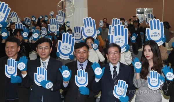 3일 오후 서울 중구 시민청에서 열린 성희롱 근절을 위한 '서울 위드유(#WithU)'출범식에서 박원순 서울시장과 안심일터 캠페인 홍보대사로 위촉된 걸스데이 유라 등 참가자들이 이번 프로젝트의 출범을 선언하고 있다. 서울시는 서울지방고용노동청, 한국프랜차이즈산업협회, 전국가맹점주협의회, 청년유니온 등 6개 기관 및 단체와 손잡고 성희롱 근절을 위한 '서울 위드유(#WithU) 공동 프로젝트'를 추진한다.