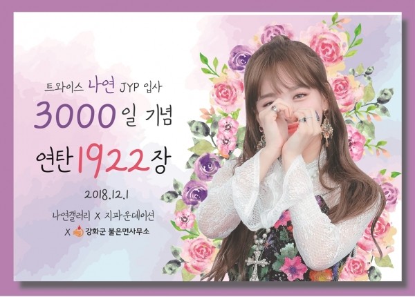 나연의 생일(9월 22일)을 상징하는 연탄 1,922장은 강화군 불은면의 다음 달 저소득 노인가정, 장애인가정 등 저소득층에게 전달될 예정이다.