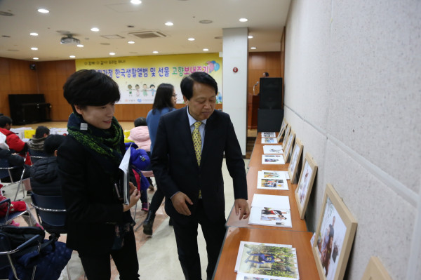 4일 구로구가 구로희망복지재단과 함께 다문화가정 고향에 앨범·선물보내기 행사를 개최했다. 이날 행사에서는 지원대상자들이 희망한 전기밥솥, 홍삼, 의류 등의 물품과 이들의 한국생활 모습이 담긴 앨범을 전달받아 직접 포장했다. 사진은 제작된 앨범을 구경하고 있는 이성 구청장(왼쪽)의 모습. (사진제공=구로구청)
