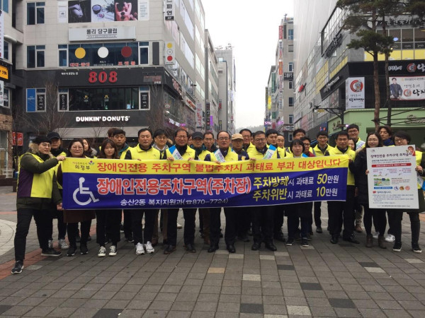 경기 의정부시 송산2동 행정복지센터 복지지원과는 4일 민락2지구 광장에서 급증하는 송산권역(송산1·2동 및 자금동) 장애인전용주차구역 위반 방지를 위한 홍보 캠페인을 실시했다. 사진은 참여자들이 캠페인을 진행하는 모습. (사진제공=의정부시청)