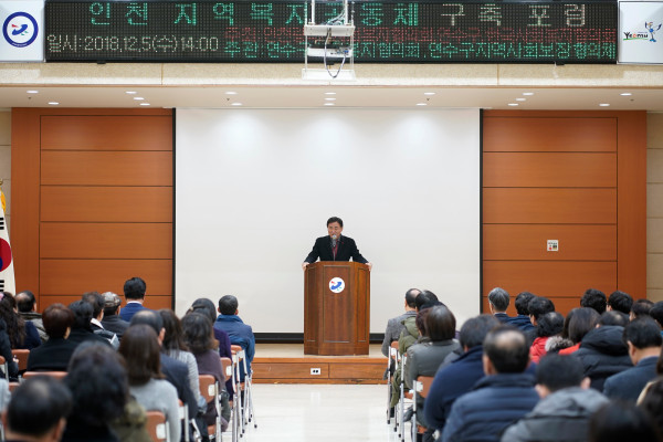 인천 연수구는 5일 구청 대회의실에서 인천 지역복지공동체 포럼을 개최했다. 이날 포럼은 연수구와 한국사회복지협의회, 인천시사회복협의회가 공동 주최했다. 사진은 고남석 구청장이 인사말을 하고 있는 모습. (사진제공=연수구청)