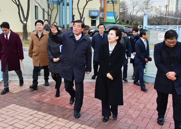 김현미 국토교통부 장관이 5일 경기 안산시를 방문했다. 이날 윤화섭 안산시장은 김 장관에게 안산시 백운공원 녹지구역 해제 등 공원 활성화 방안에 관해 건의했다. 사진은 윤 시장이 김 장관과 이야기를 나누고 있는 모습. (사진제공=안산시청)