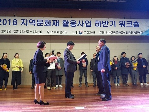함안군은 지난 6일 문화재청 주관으로 충남 보령에서 열린 ‘2018년 하반기 문화재 활용사업 워크숍’에서 '함안화천농악과 함께 가야문화 마실가자!‘가 생생문화재 우수사업으로 선정돼 문화재청장으로부터 함안군은 기관표창을, 사업을 주관한 함안화천농악은 단체상과 시상금을 각각 수상했다고 밝혔다.