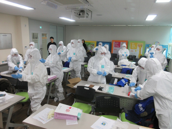 경기 남양주 풍양보건소는 최근 지역내 자율방재단을 대상으로 조류인플루엔자(AI) 인체대책반 민·관 합동 교육을 실시했다. 이날 교육에서는 개인보호복을 직접 입고 벗는 실습 교육이 진행됐다. 사진은 자율방재단원들이 실습 교육을 받는 모습. (사진제공=남양주시청)