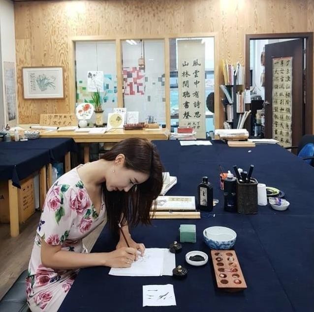 공개된 사진 속 황미나는 꽃무늬 원피스를 입은 채 서예에 집중하고 있다. 손끝에 온 신경을 집중한 그의 모습에 시선이 집중된다.
