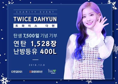 다현의 생일(5월 28일)을 상징하는 연탄 1528장과 등유 400L는 남양주 동부희망케어센터를 통해 독거노인, 장애인가정 등 취약계층 6가정에 전달됐다.