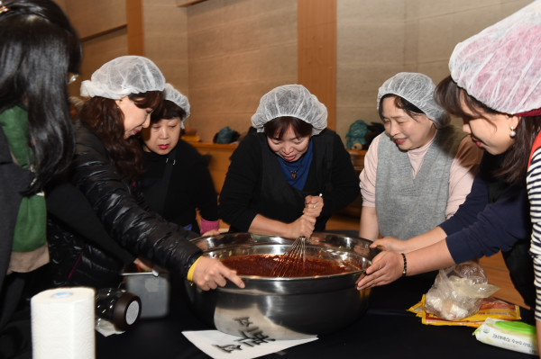 서울 노원구는 GMO(유전자조작식품)로부터 안전한 사회를 만들기 위해 10일 오후 2시 구청 대강당에서 ‘친환경 전통 고추장 담기 행사’를 개최했다. 이날 고추장 담기 행사에는 촌장협동조합 조합원 및 주민 100여명이 참여해 우리의 전통 장 담그는 방법을 익히는 시간을 가졌다. (사진제공=노원구청)