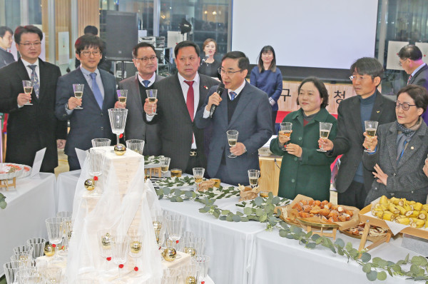 서울 도봉구는 10일 주민·관계자 등 200명이 참석한 가운데 '구민청 개관식'을 개최했다. 행사는 도봉문화재단에서 주관했으며, 오는 15일까지 진행된다. 사진은 인사말을 전하고 있는 이동진 구청장(오른쪽에서 네 번째) 모습. (사진제공=도봉구청)