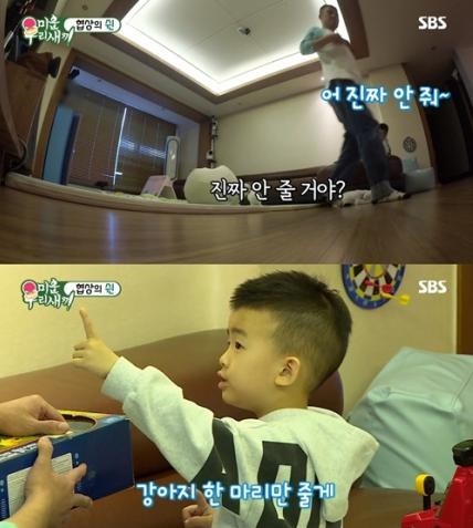 이내 방에서 나온 그는 장난감을 한 아름 안아들고 나왔으나 “안 줄 거야”라는 조카의 말에 좌절을 맛보는 듯했다. 하지만 그가 “나도 안 줄거야”라고 하자 장난감이 갖고 싶었던 조카는 “강아지 한 마리만 줄게”라며 협상을 타결했다.