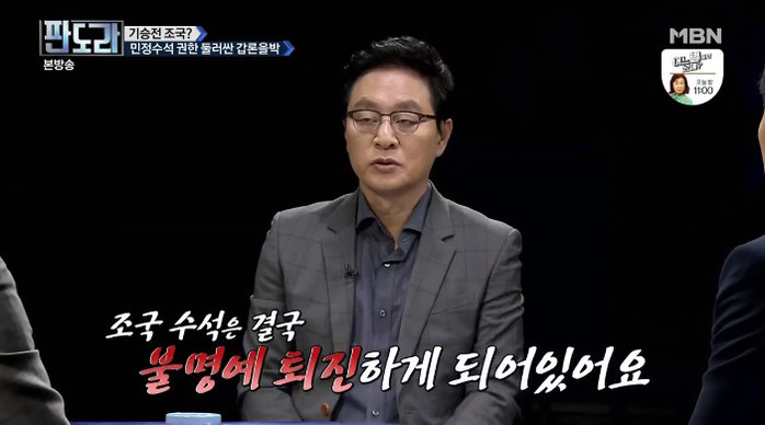 지난 10일 방송된 MBN '판도라'에서 정두언 전 의원은 "조국 민정수석은 결국 불명예 퇴진하게 되어 있다. 무능하기 때문에. 문 대통령은 조국 수석을 경질하면 앞으로의 인사권도 휘둘릴까 걱정될 것이다. 그러나 조국 수석은 제가 볼때는 일을 할 줄 모른다"고 말했다.