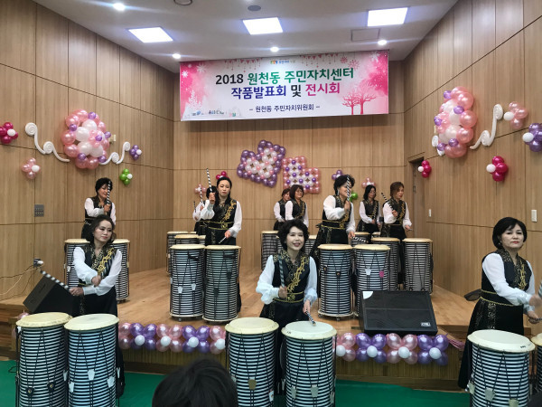 경기 수원시 영통구 원천동 주민자치센터는 최근 행정복지센터 3층에서 ‘2018년도 주민자치센터 작품발표회 및 전시회’를 개최했다. 사진은 프로그램 수강생들이 난타 공연을 선보이는 모습. (사진제공=수원시청)