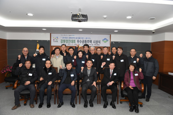 서울 노원구가 11일 구청 5층 기획상황실에서 ‘음식물쓰레기 감량 경진대회 우수 공동주택 시상식’을 개최했다. 지난 6~9월 100가구 이상 177개 공동주택이 참여한 가운데 열린 이번 경진대회에서는 상계주공1단지아파트 등 6곳이 최우수 아파트로, 상계주공7단지 등 9곳이 우수 아파트로 선정됐다. 사진은 시상식에 참석한 오승록 구청장(앞줄 오른쪽에서 세 번째) 및 관계자들이 "파이팅"을 외치는 모습. (사진제공=노원구청)