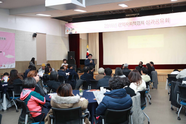 서울 관악구는 최근 관악구민회관에서 관악사회적경제지원센터와 함께하는 ‘2018년 관악사회적경제 성과공유회’를 개최했다. 사진은 행사에 참여한 박준희 구청장이 인사말을 하는 모습. (사진제공=관악구청)