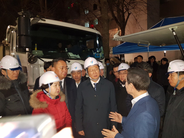 11일 서울 양천구 목동 1단지 아파트 인근에서 열수송관 파열사고가 발생함에 따라 1800여가구가 온수·난방 공급이 중지되는 사고가 발생했다. 이에 구는 즉시 서울에너지공사와 협력해 20명의 인원과 장비를 투입, 복구작업을 마쳤다. 사진은 사고현장을 살펴보는 김수영 구청장(왼쪽에서 두 번째)의 모습. (사진제공=양천구청)